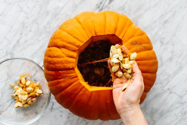 - Scoop and wash. Scoop out the seeds from the cavity using a large spoon and place them in a colander, set over a bowl of water. Rinse them thoroughly and remove any leftover stringy pumpkin pulp.