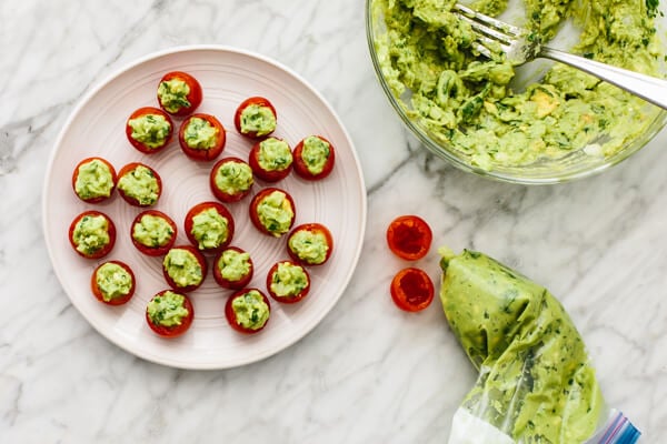 Make a piping bag by cutting the corners of a ziplock bag and squeeze a small mound of guacamole into each tomato half.