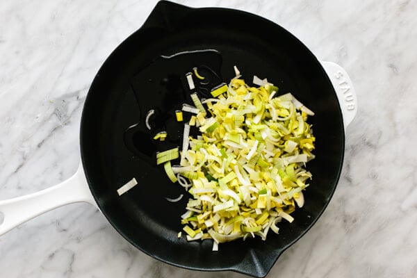 Preheat the oven to 400F/200C. Heat the oil in a 10-inch oven-safe skillet over medium heat. Add the leek and saute for 3-4 minutes.